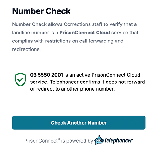 We’ve created a tool that you can give the prison so they can confirm that your PrisonConnect Cloud service is not a forwarding number or redirection service and should therefore be allowed.