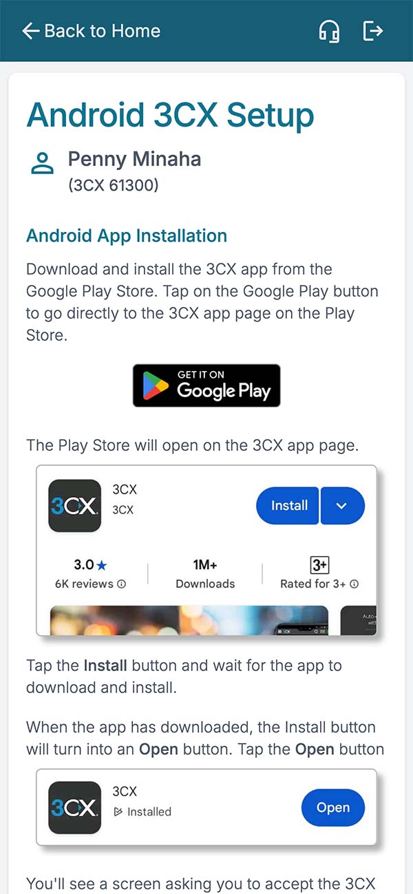 Click the Set up 3CX button to get simple, step-by-step instructions that will get you up and running in minutes. The instructions are customised so you only get the steps you need for your situation and device. Here’s the start of the Android installation section.